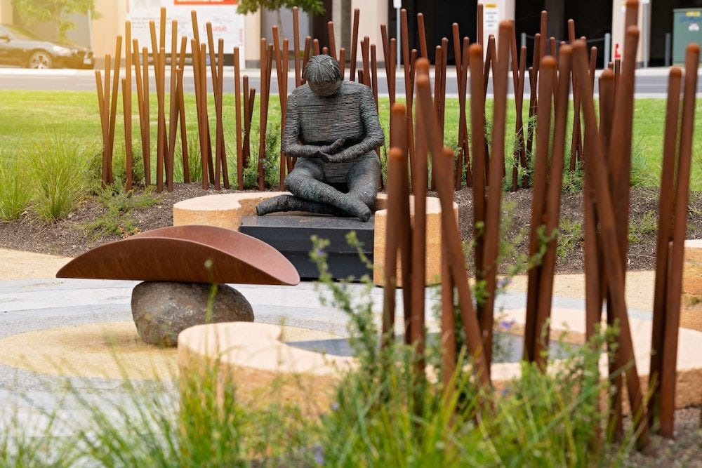 In Rymill Park / Murlawirrapurka, Adelaide, the ‘Place of Reflection’ is a space for members of the Stolen Generations, their families, friends, and the wider community to meet and support each other. At the centre of the space is a bronze sculpture created by renowned Ngarrindjerri weaver Aunty Yvonne Koolmatrie and South Australian designer Karl Meyer.